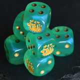 Happy Squiggle Cat is a jumping squiggle cat with heart farts engraved on a borealis light green dice (new glitter but not luminary).